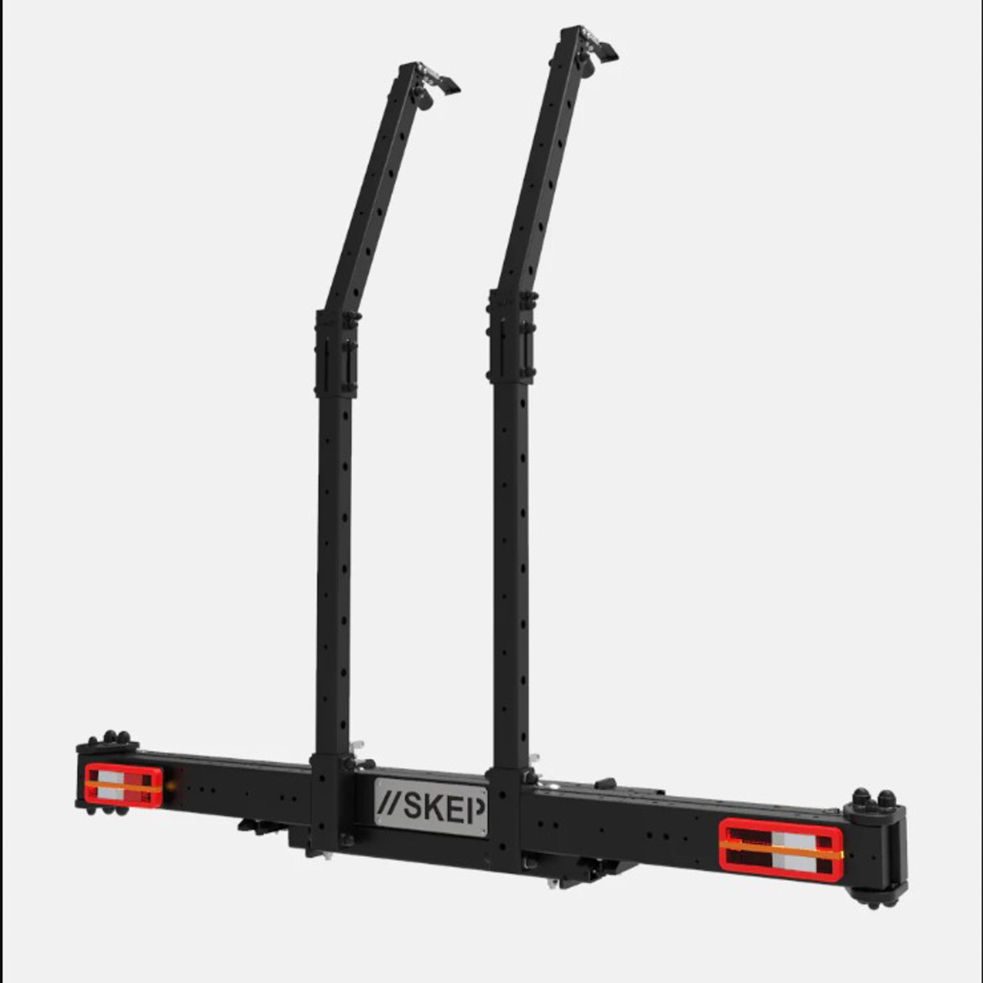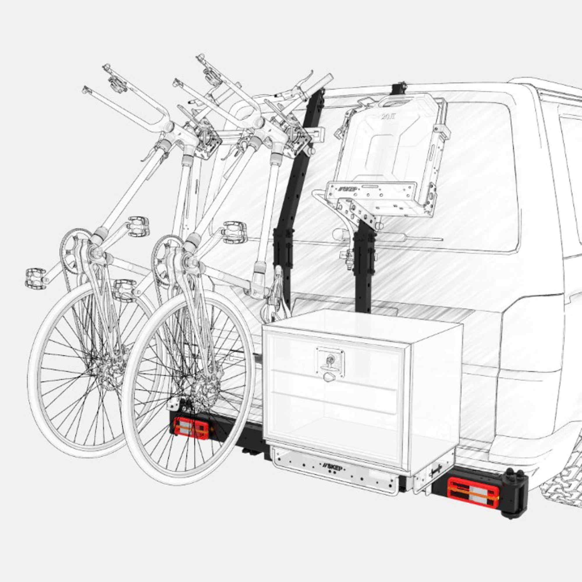 Le porte-matériel peut transporter des vélos électriques, des caisses de rangements, des roues de secours, des jerrycans, douches solaires etc. 100% modulable, il est pensé pour évoluer dans le temps. Le porte-matériel peut recevoir une multitude d’accessoires complémentaires : des plaques de désensablage, des bidons Rotopax, une boule d’attelage, des feux LED, ainsi que les futurs modules SKEP.