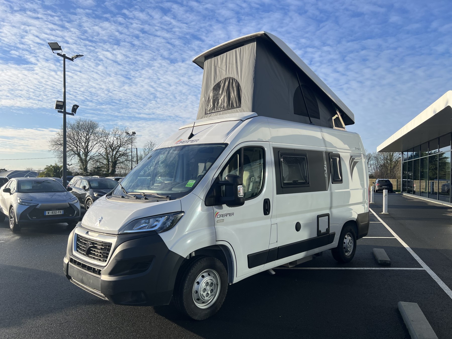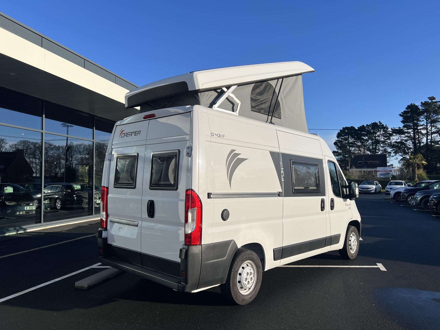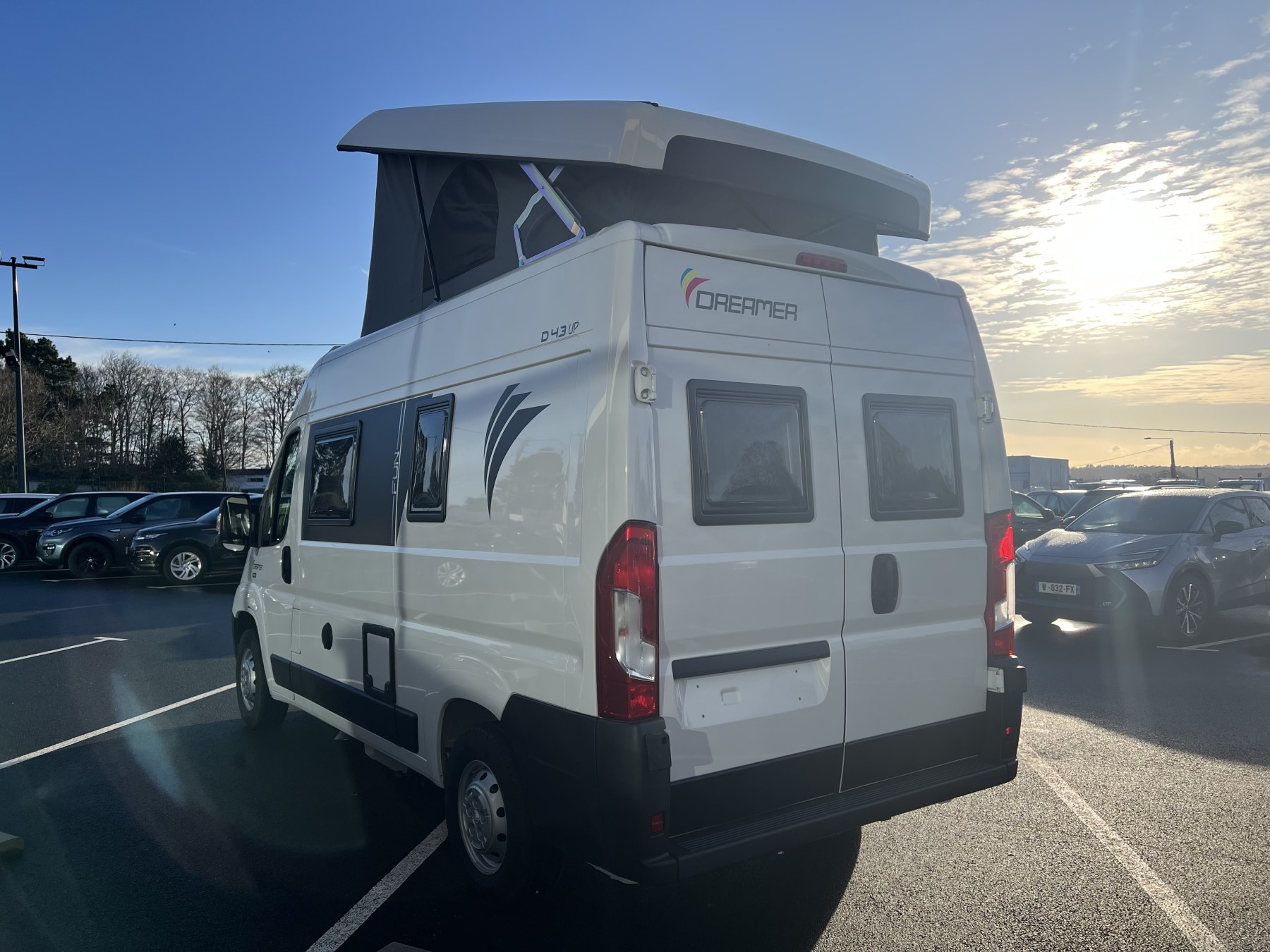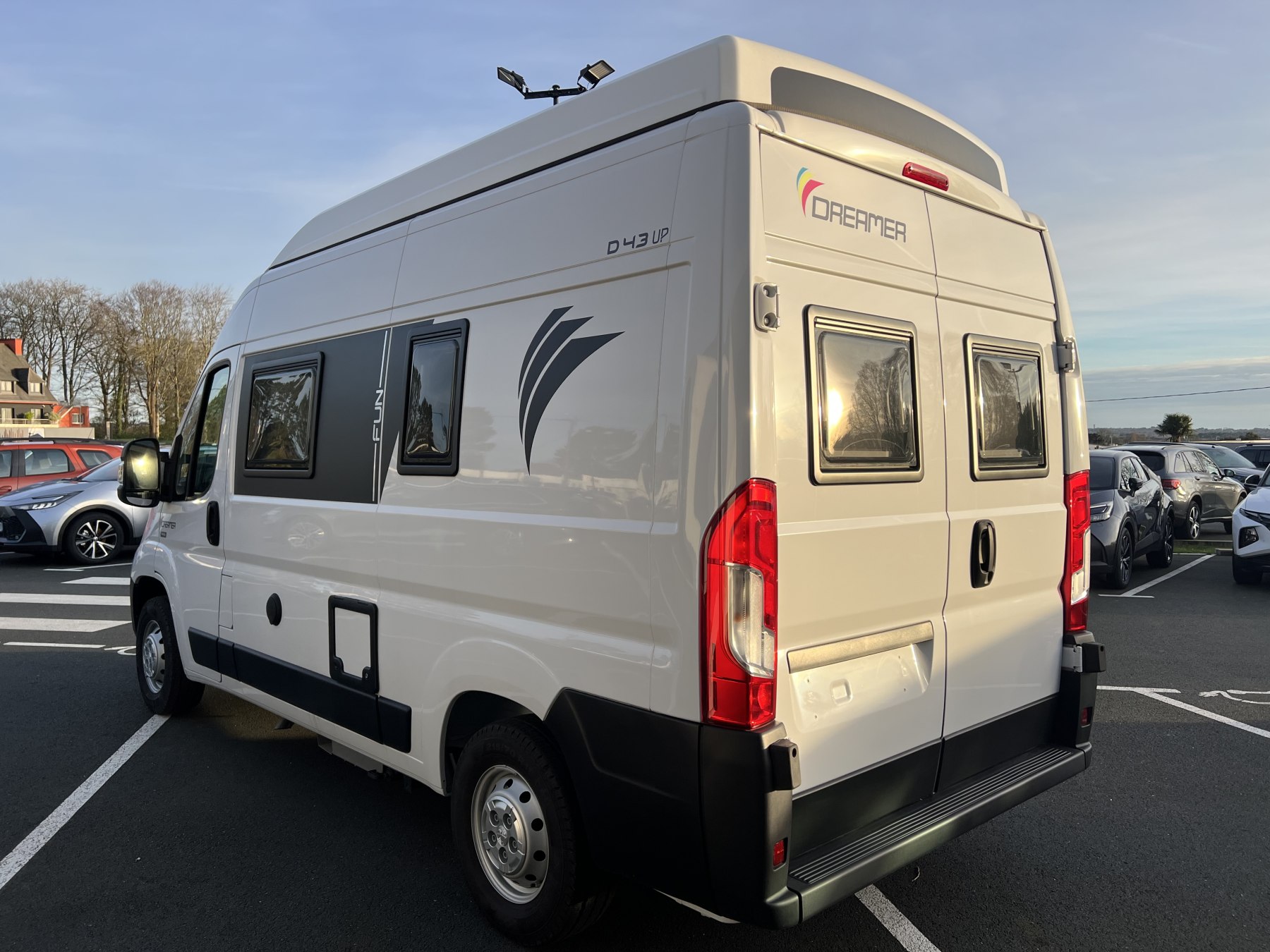 • Pack FUN (Pare-choc avant non peint Rangement au-dessus de la cabine Chauffage gaz 4100 W et chauffe-eau gaz Ambiance tissu EKYNOX Salle d'eau MODUL'SPACE® avec rideau de douche (D55, D55 UP) ou salle d'eau monobloc (D43 UP, CAMPER FIVE, CAMPER SPORT) Vo