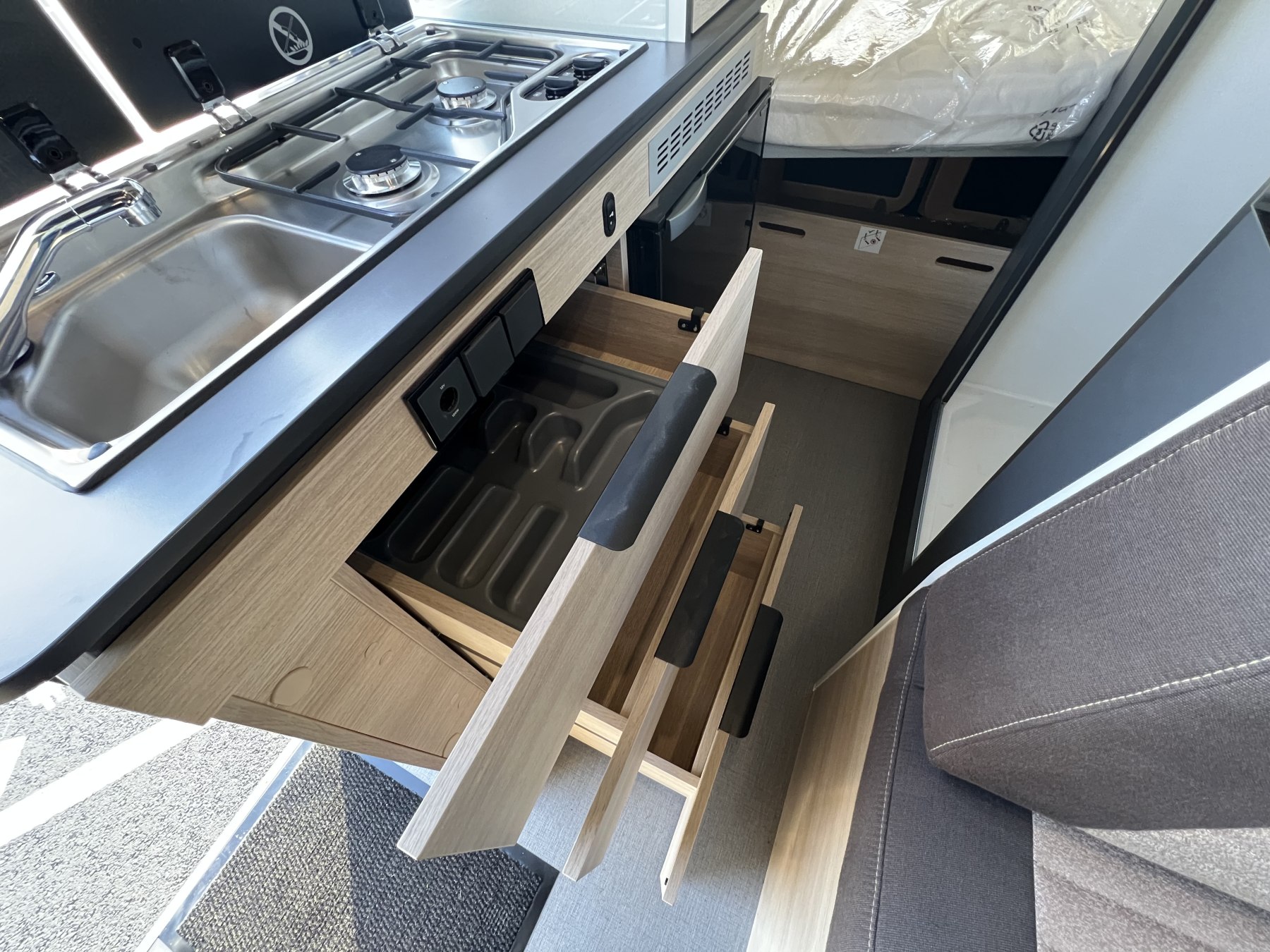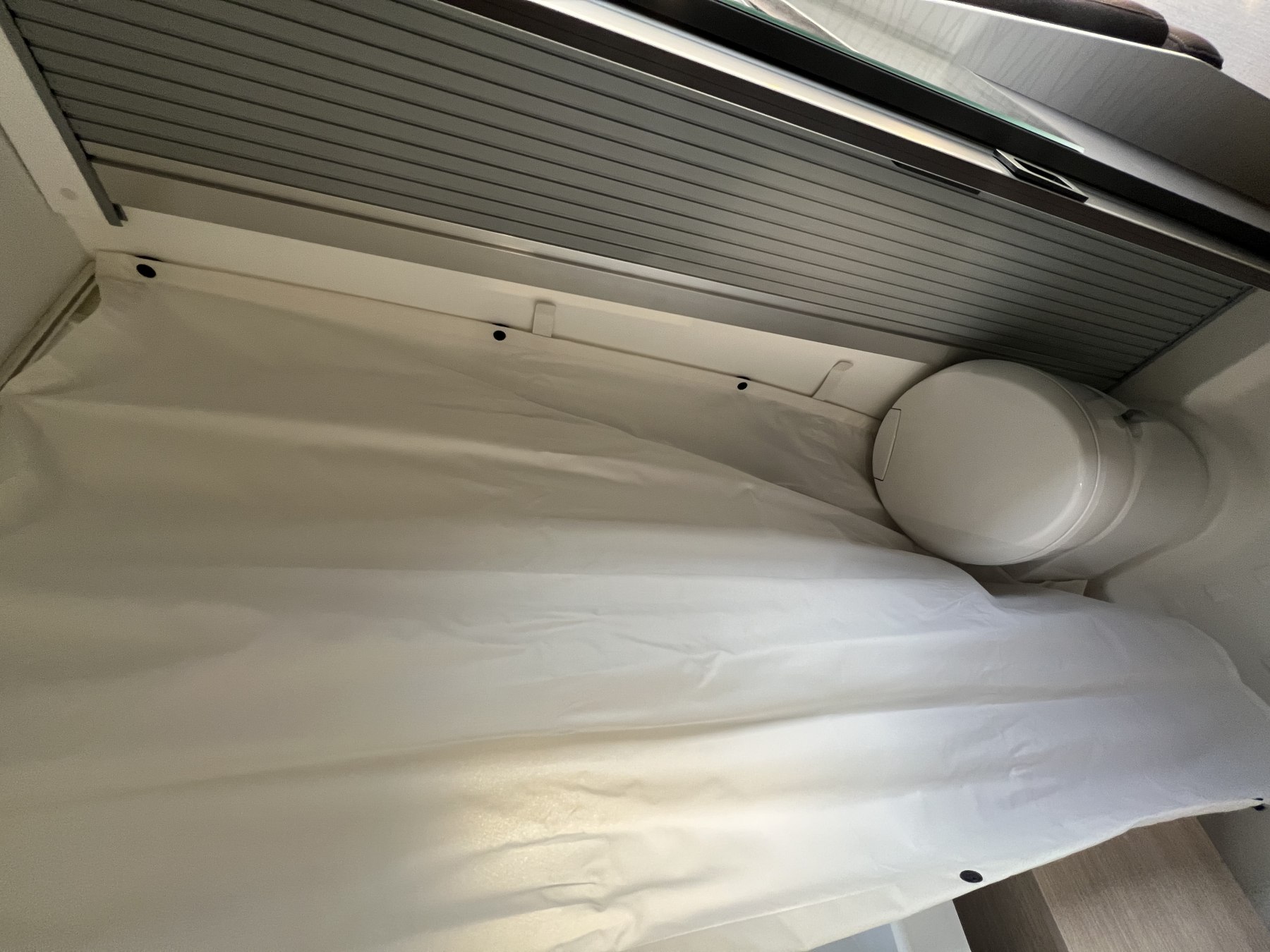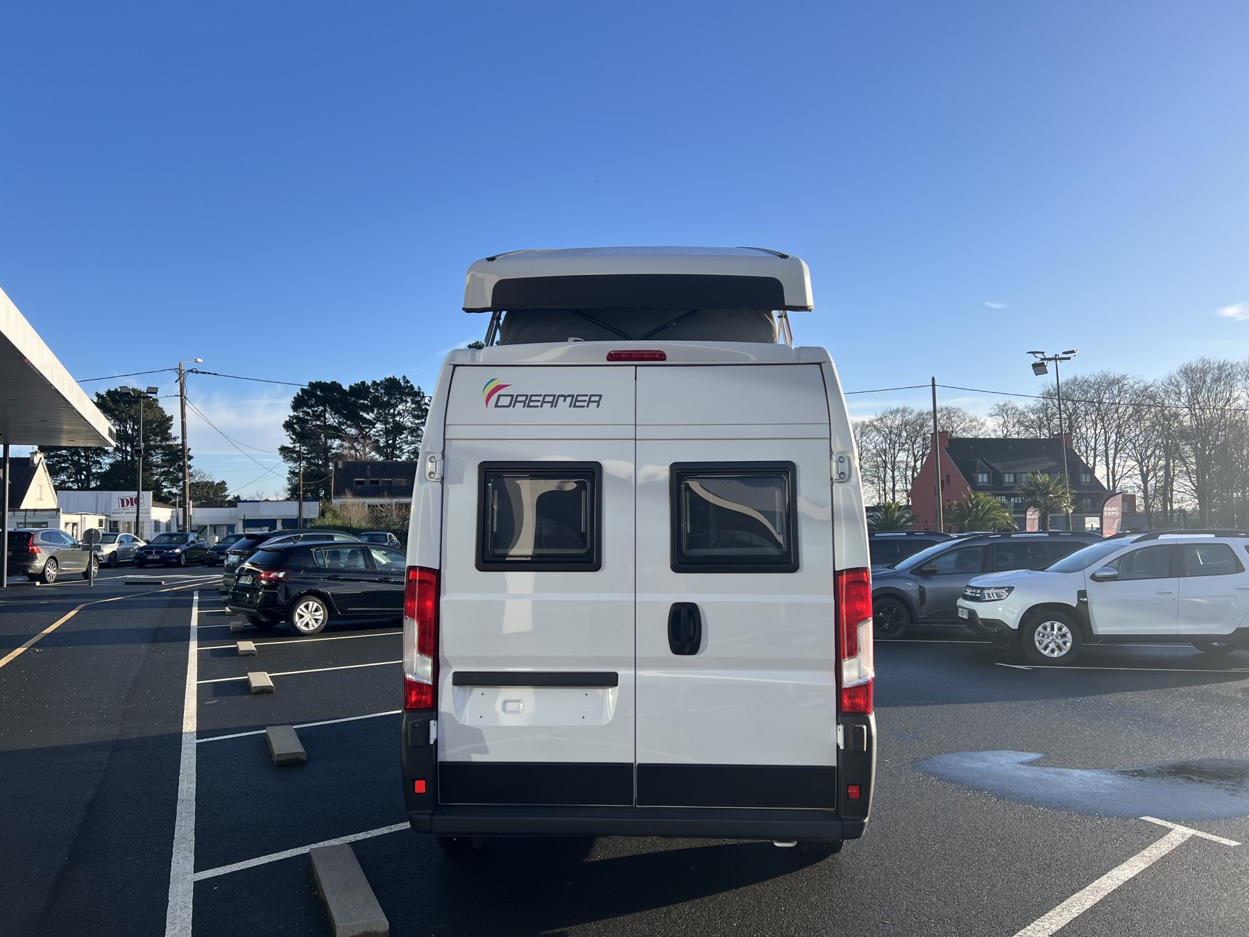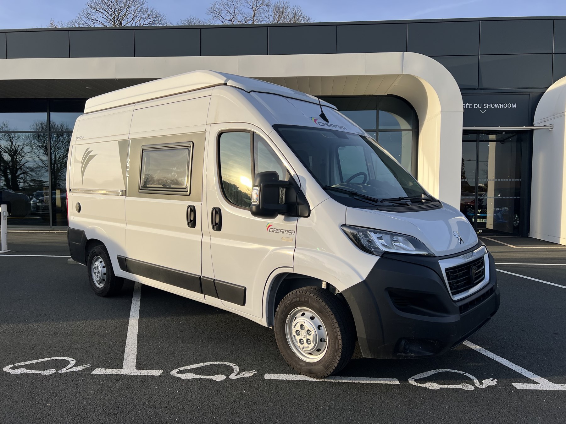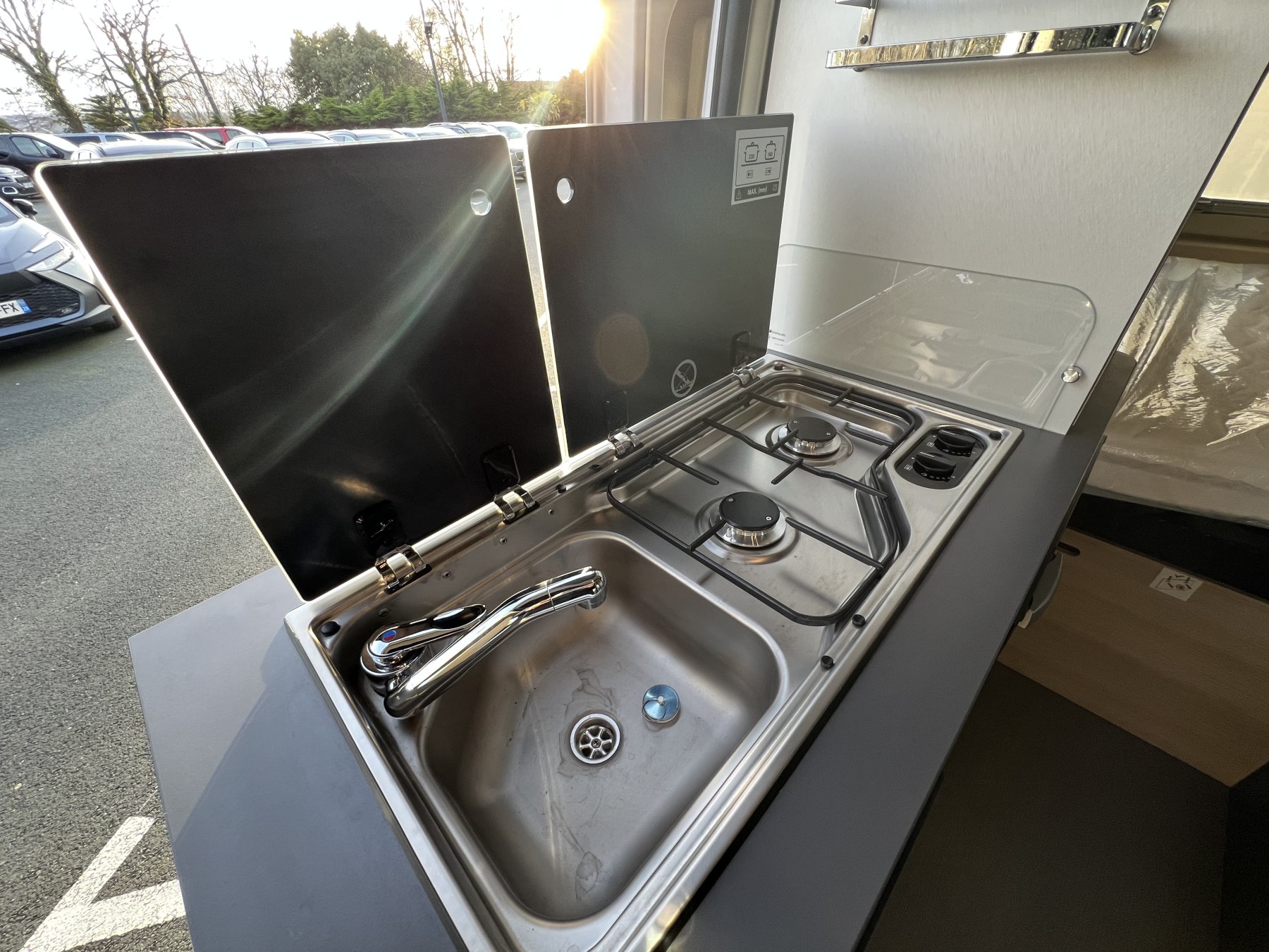 • Pack FUN (Pare-choc avant non peint Rangement au-dessus de la cabine Chauffage gaz 4100 W et chauffe-eau gaz Ambiance tissu EKYNOX Salle d'eau MODUL'SPACE® avec rideau de douche (D55, D55 UP) ou salle d'eau monobloc (D43 UP, CAMPER FIVE, CAMPER SPORT) Vo