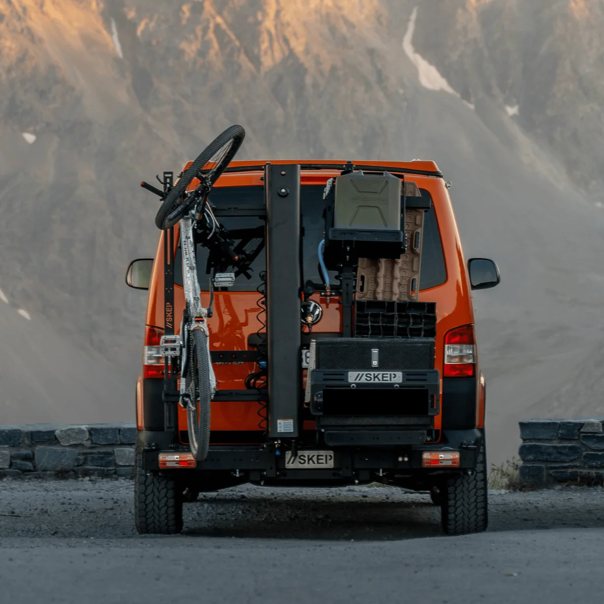 Le porte-matériel peut transporter des vélos électriques, des caisses de rangements, des roues de secours, des jerrycans, douches solaires etc. 100% modulable, il est pensé pour évoluer dans le temps. Le porte-matériel peut recevoir une multitude d’accessoires complémentaires : des plaques de désensablage, des bidons Rotopax, une boule d’attelage, des feux LED, ainsi que les futurs modules SKEP.