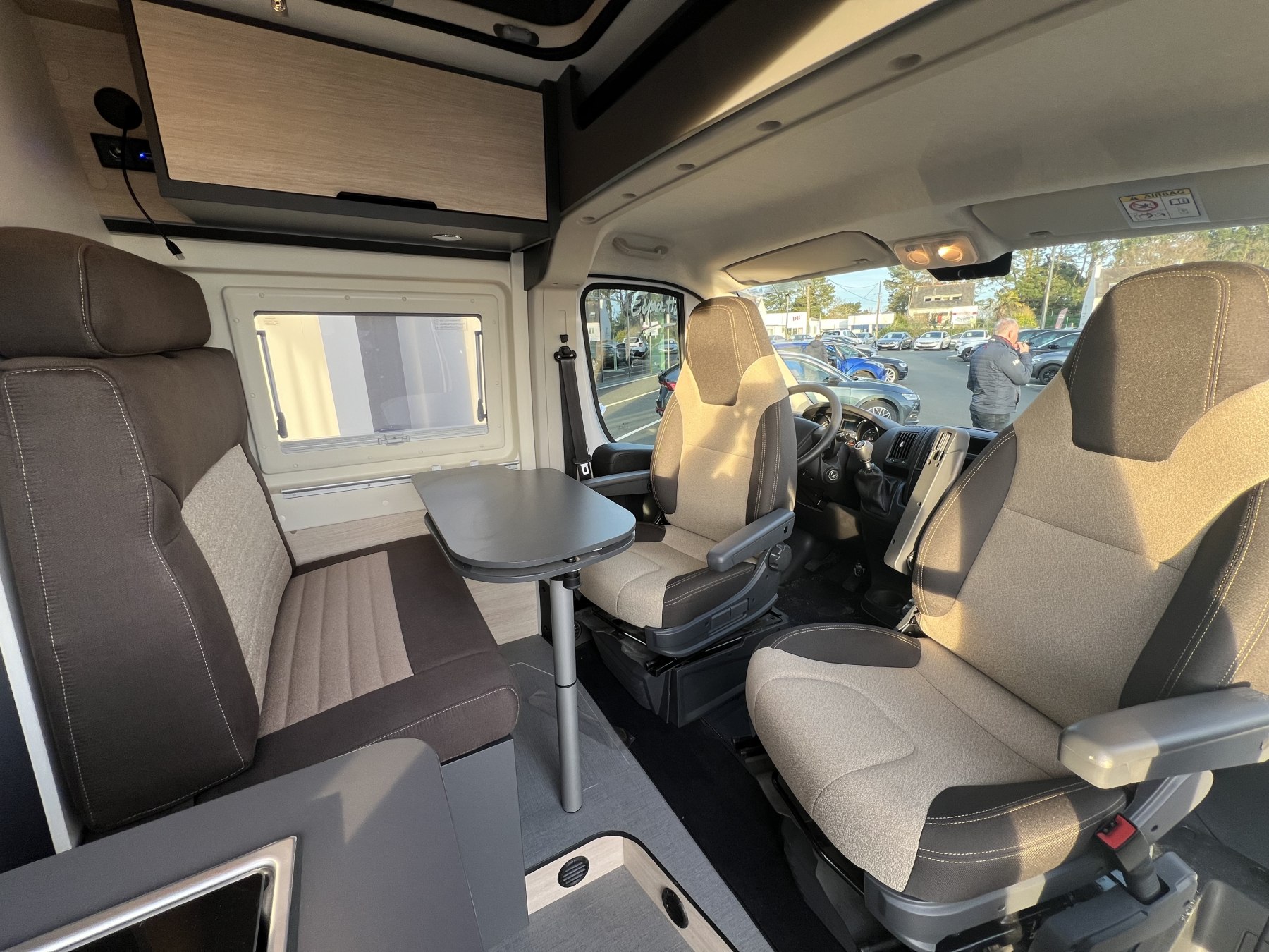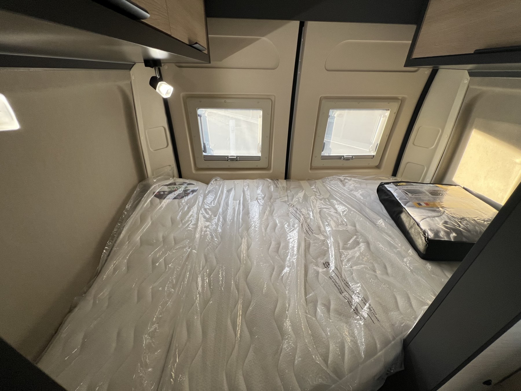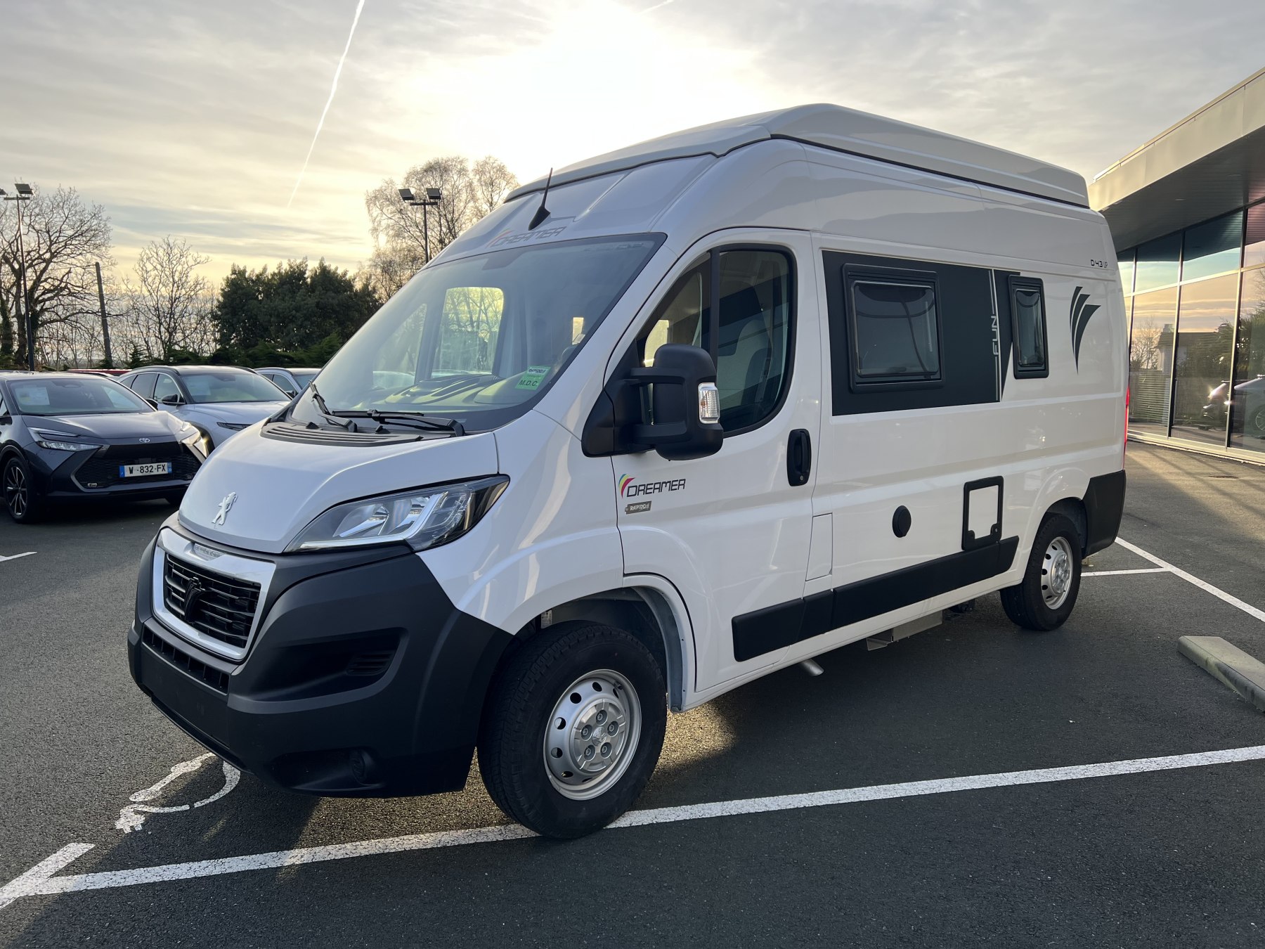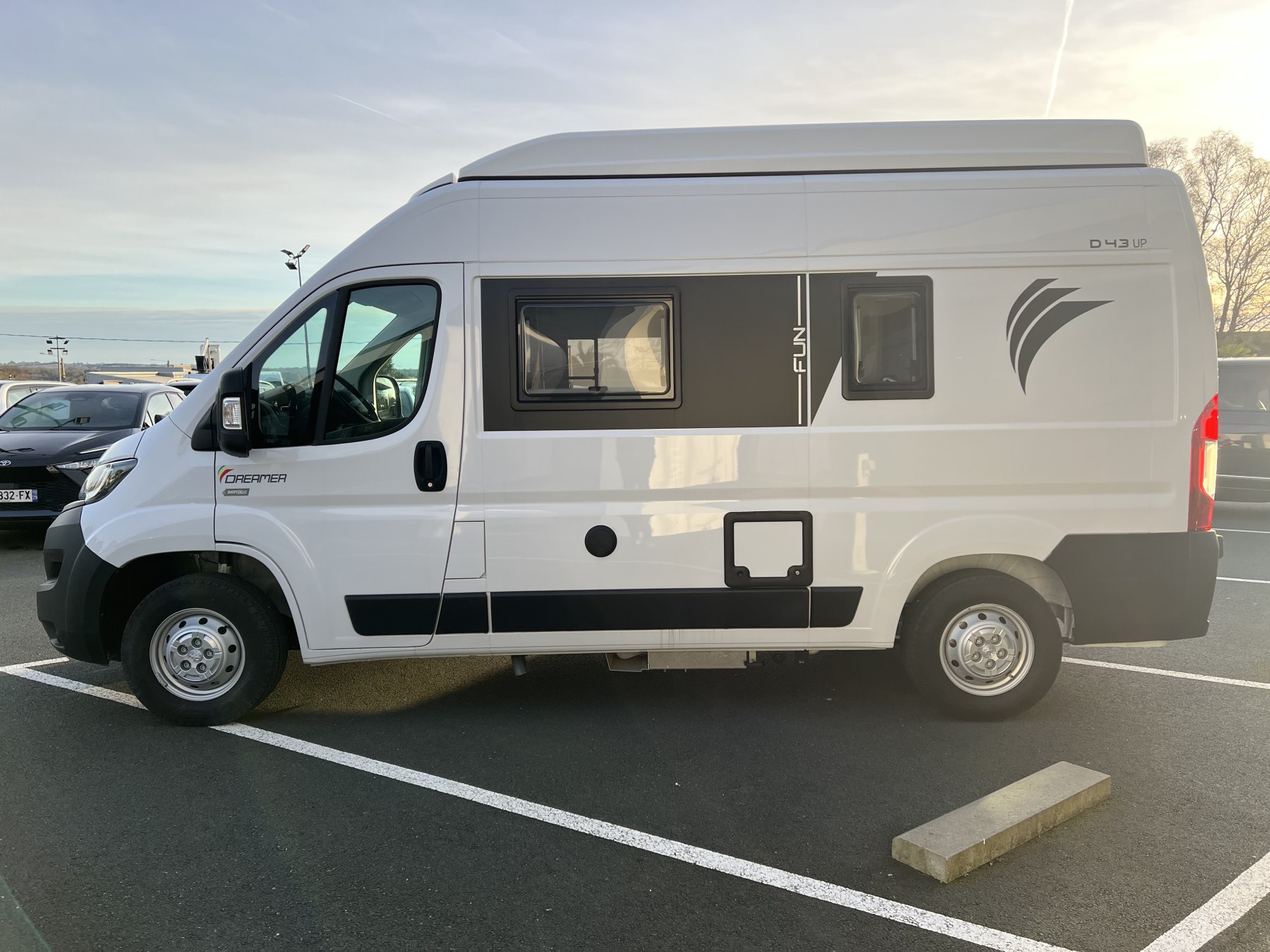 • Pack FUN (Pare-choc avant non peint Rangement au-dessus de la cabine Chauffage gaz 4100 W et chauffe-eau gaz Ambiance tissu EKYNOX Salle d'eau MODUL'SPACE® avec rideau de douche (D55, D55 UP) ou salle d'eau monobloc (D43 UP, CAMPER FIVE, CAMPER SPORT) Vo
